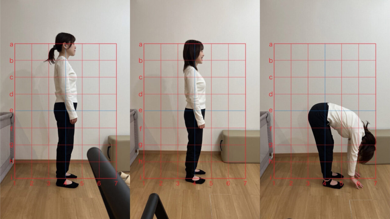 初回は姿勢の評価からはじまり、グリッドが入った写真で姿勢をチェック。想像以上に崩れた自分の姿にショックを受けました。